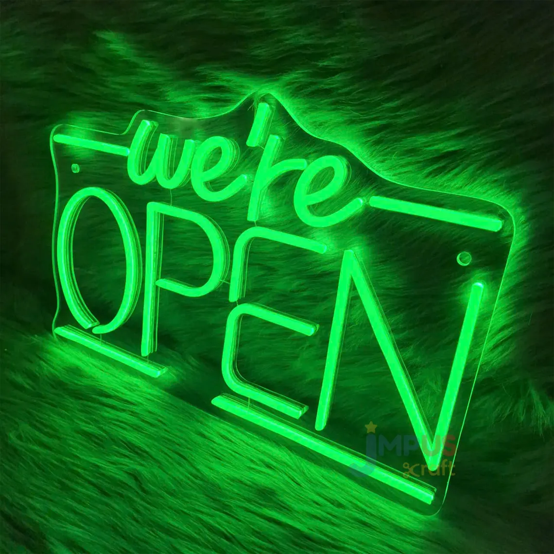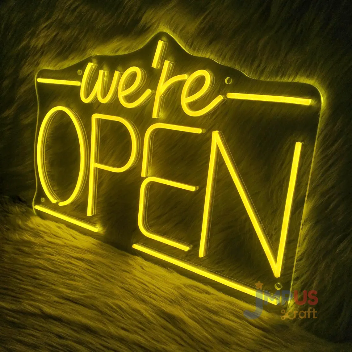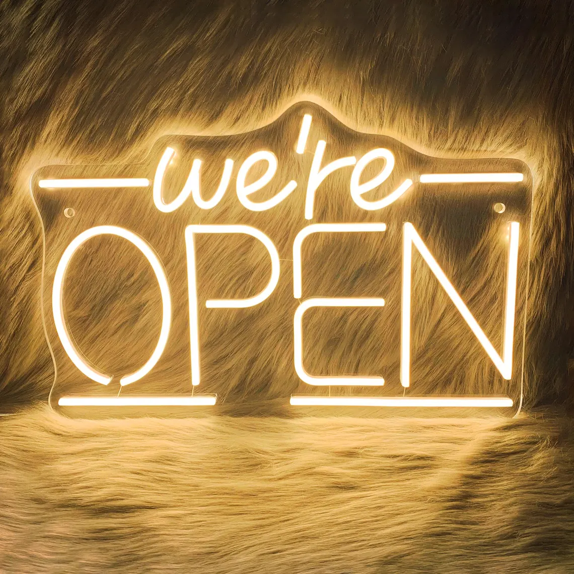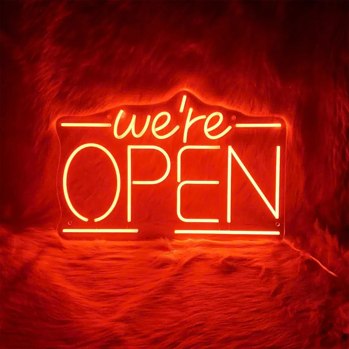 We’re Open neon sign featuring bright, inviting lettering glowing in vibrant LED light—perfect for shops, cafés, salons, or any business looking to attract customers with a welcoming vibe, adding visibility and charm to windows, walls, or storefronts