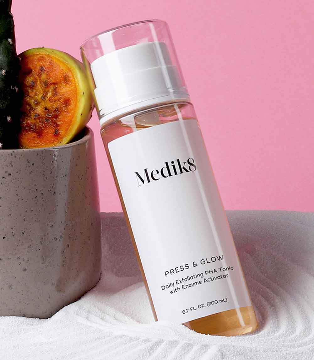 The Medik8 Press & Glow delivers its formula using a handy pump action. The powerful formula of 5.5% gluconolactone provides the skin with both exfoliation and hydration. Blended with another exfoliant, prickly pear plant, the toner helps support the skin’s natural cell turnover for a more radiant and luminous effect.